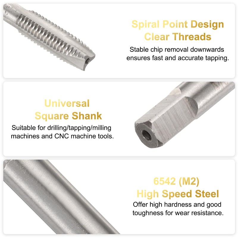 The tapping bit features spiral point, plug chamfers and right-hand threading. Straight groove taps can remove chips downwards, with clear threads and sharp cutting edges to ensure fast and precise thread cutting.