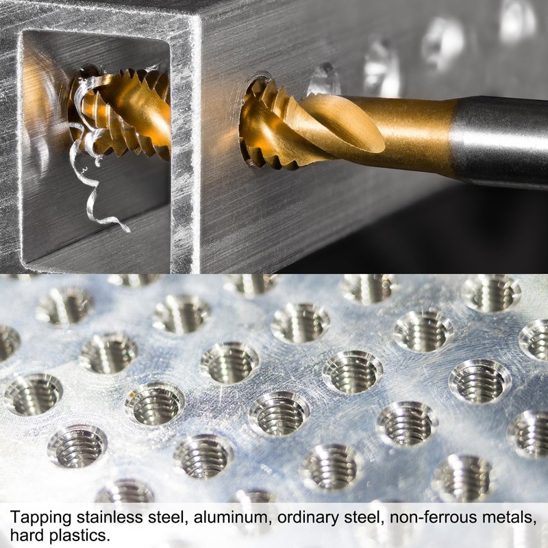 • Applications: Taps are great for working blind holes and sticky materials. Used for drilling and tapping stainless steel, aluminium, alloy steel, ordinary steel, cast iron, non-ferrous metals, hard plastics, etc. The grooves on the tap help remove chips and dirt from the hole.