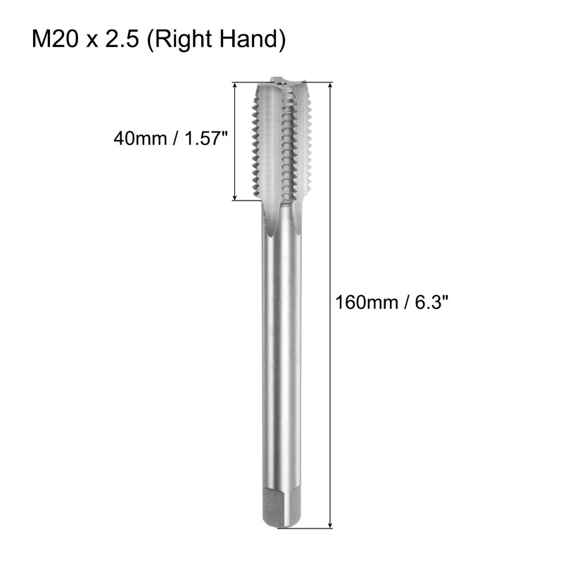 - Metric tap: thread size: M20 x 2.5 (right-hand thread); accuracy: H2; total length: 160 mm/6.3 inches (extra long); square shank width: 11 mm/0.43 inches; thread length: 40 mm/1.57 inches; number of flutes: 4 flutes