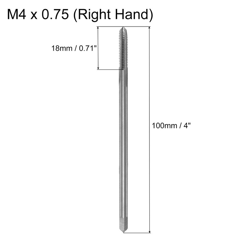 - Metric Tap: Thread Size: M4 x 0.75 (Right); Accuracy: H2; Total Length: 100mm/4" (Extra Long); Square Shank Width: 3mm/0.12"; Thread Length: 18mm/0.71"; Number of Flutes: 3 Flutes
