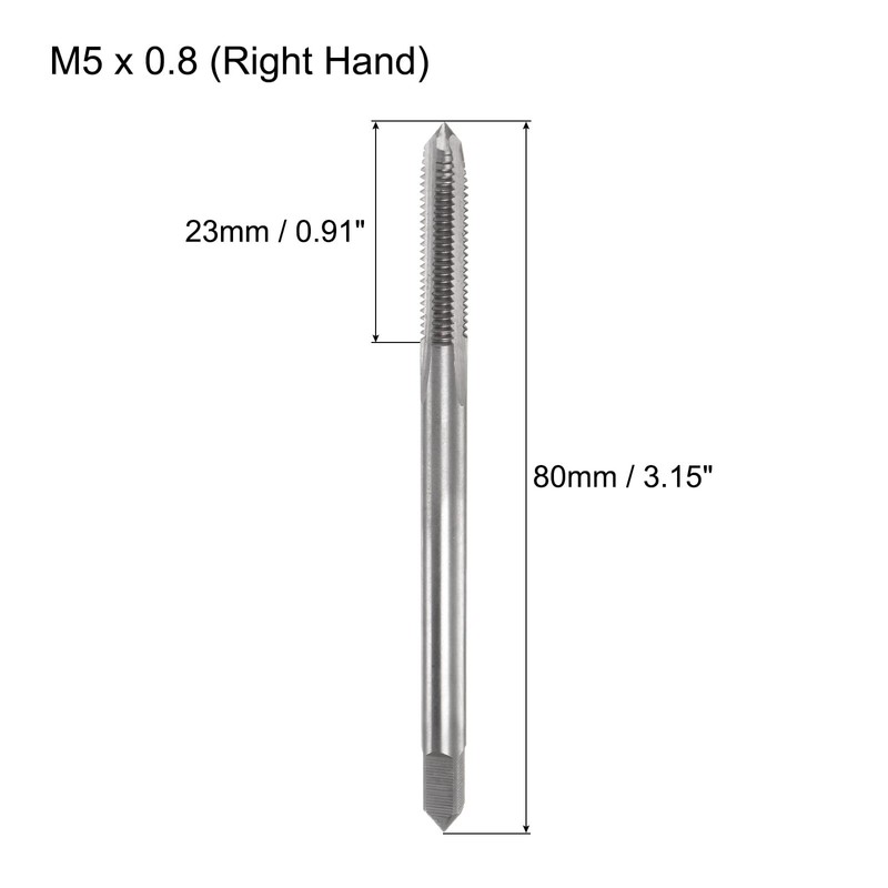 • Metric tap: thread size: M5 x 0.8 (right-hand thread); accuracy: H2; total length: 80 mm/3 inches (extra long); square shank width: 4 mm/0.16 inches; thread length: 23 mm/0.91 inches; number of flutes: 3 flutes