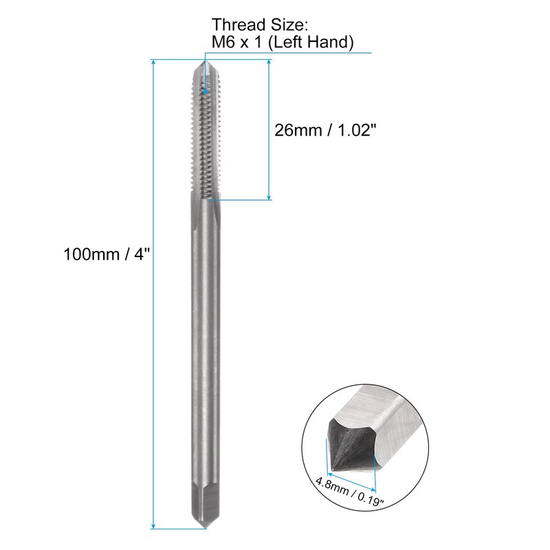 • Metric tap: thread size: M6 x 1 (left thread); accuracy: H2; total length: 100 mm/4 inches (extra long); square shank width: 4.8 mm/0.19 inches; thread length: 26 mm/1.02 inches; number of flutes: 3 flutes
