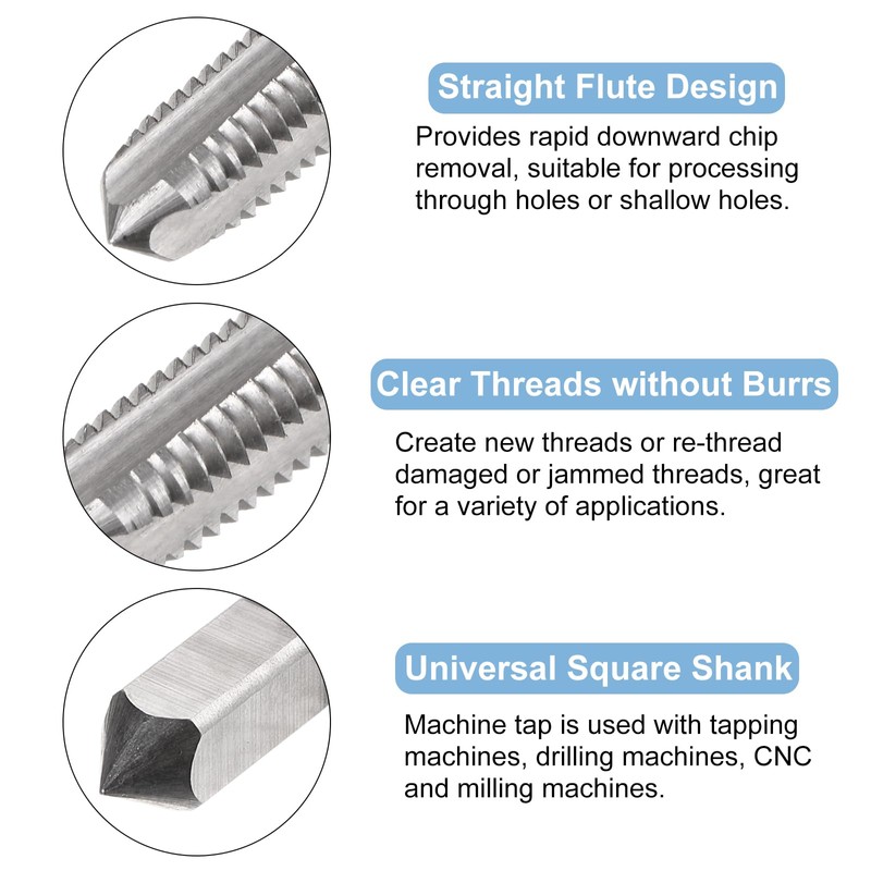 • Straight flute tap: straight flute design, clear thread without burrs, right hand thread. Provides fast downward chip removal for efficient tapping, suitable for machining through holes or shallow holes.