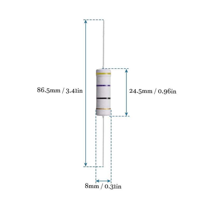 - ! Specification - Rated power: 5 W, Maximum operating voltage: 500 V, Maximum overload voltage: 1000 V, Dielectric that can withstand voltage: 700 V, Operating temperature range: -55 °C ~ 155 °C, Resistance values (ohm): 47, Resistance tolerance (%): 5%, Body size: 24.5±2.0 mm x 8.0±1 0 mm (LxT), total length: 86.5±5.0mm, connection wire size: 31±5mm x 0.7±0.1mm (L x D)