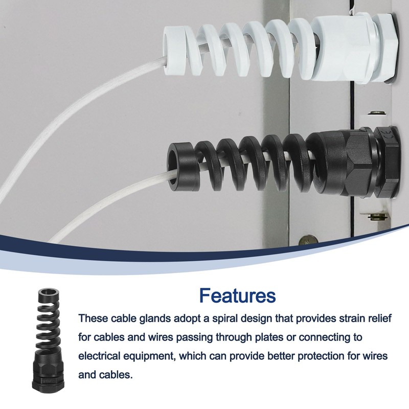 - [DESIGN]: These cable glands use a spiral design that provides strain relief for cables and wires passed through plates or connected to electrical equipment, which can provide better protection for wires and cables.