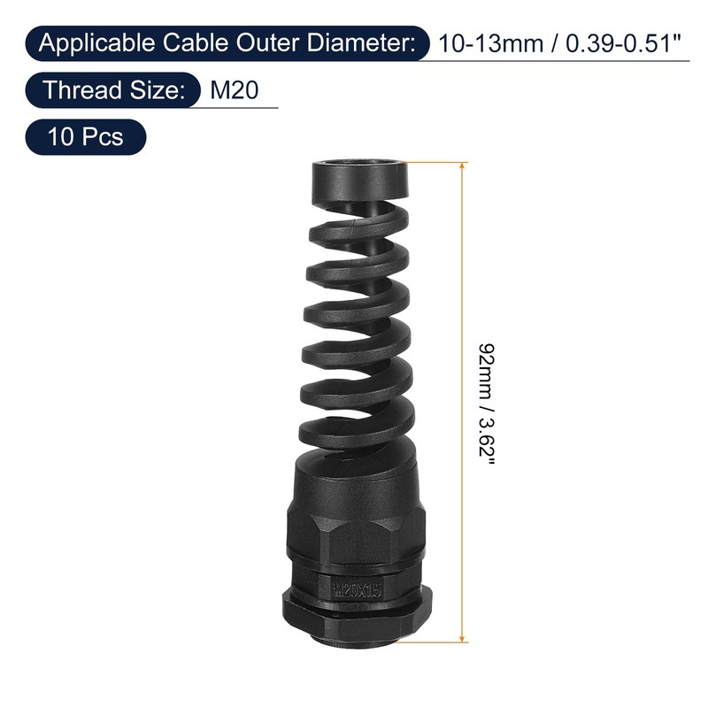 - [SIZE & PACKAGING]: Thread size: M20; Applicable cable outer diameter: 10-13mm / 0.39-0.51"; Length: 92mm / 3.62". The package contains 10 pieces of waterproof cable glands.