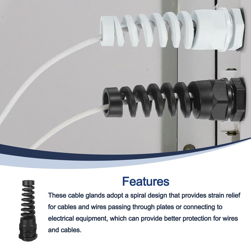 - [DESIGN]: These cable glands adopt a spiral design, which provides strain relief for cables and wires passed through plates or connected to electrical equipment, which can provide better protection for wires and cables.