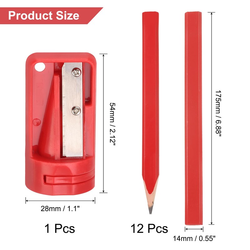 - Dimensions: contains 12 red carpenter's pencils and 1 pencil sharpener of the same colour, the pencil size is 175 x 14 x 7 mm, the pencil sharpener size is 54 x 28 x 12 mm.