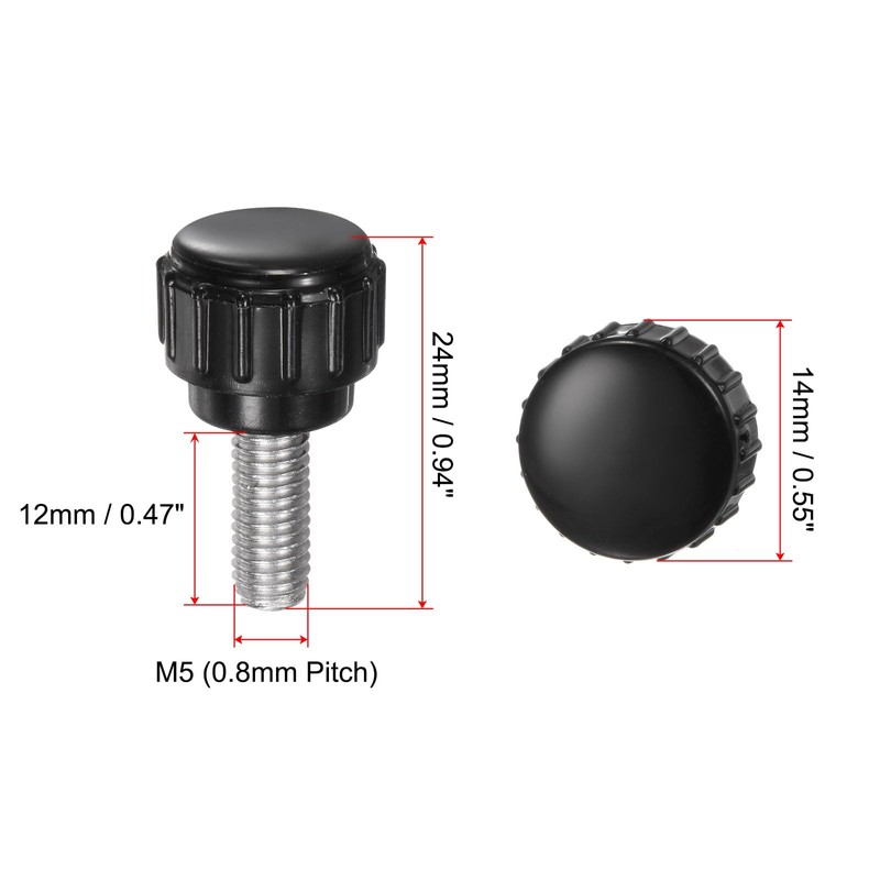- Standard thread size: M5 (0.8 mm pitch); thread length: 12 mm/0.47 inches; knurled head diameter: 14 mm/0.55 inches; total height: 24 mm/0.94 inches. The screws are neat and clear, the force is uniform and it is not easy to slip.