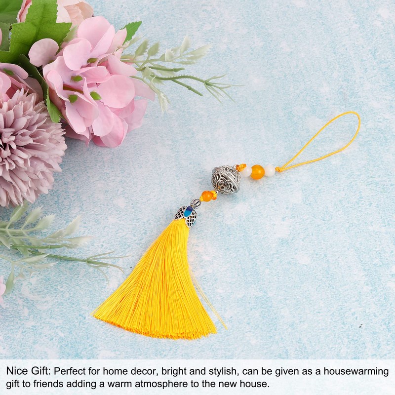 - Material: silky tassel + alloy bell; total length: 19 cm/7.48 inches; bell diameter: 17 mm/0.67 inches; colour: yellow