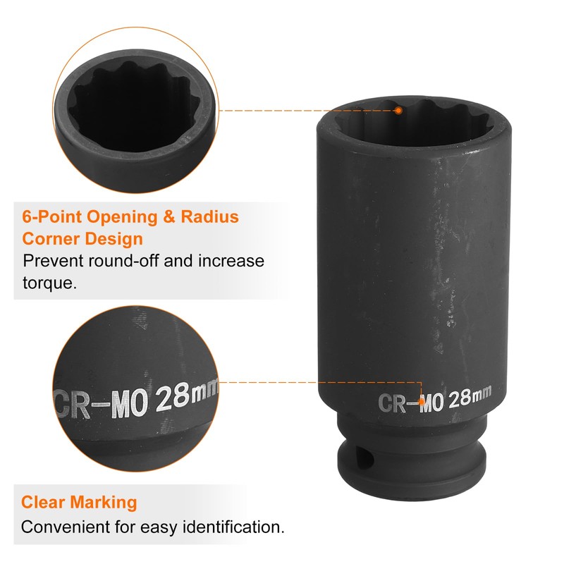 - Size - Drive: 1/2 inch, 6 point socket size: 28 mm, total length: 78 mm. The specifications are clearly marked on the surface of the socket wrench, which facilitates identification and improves work performance.