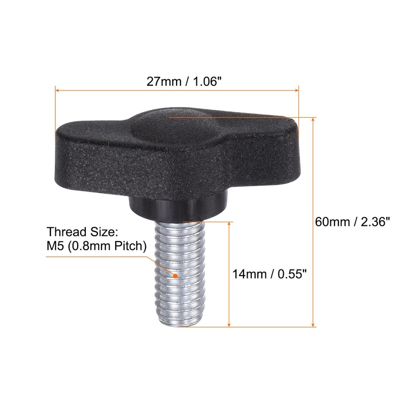 - Size - Standard Thread Size: M6 (1mm Pitch); Thread Length: 14mm; Tee Wing Head Width: 27mm; Total Length: 24mm; Button Style: Tee; Color: Black