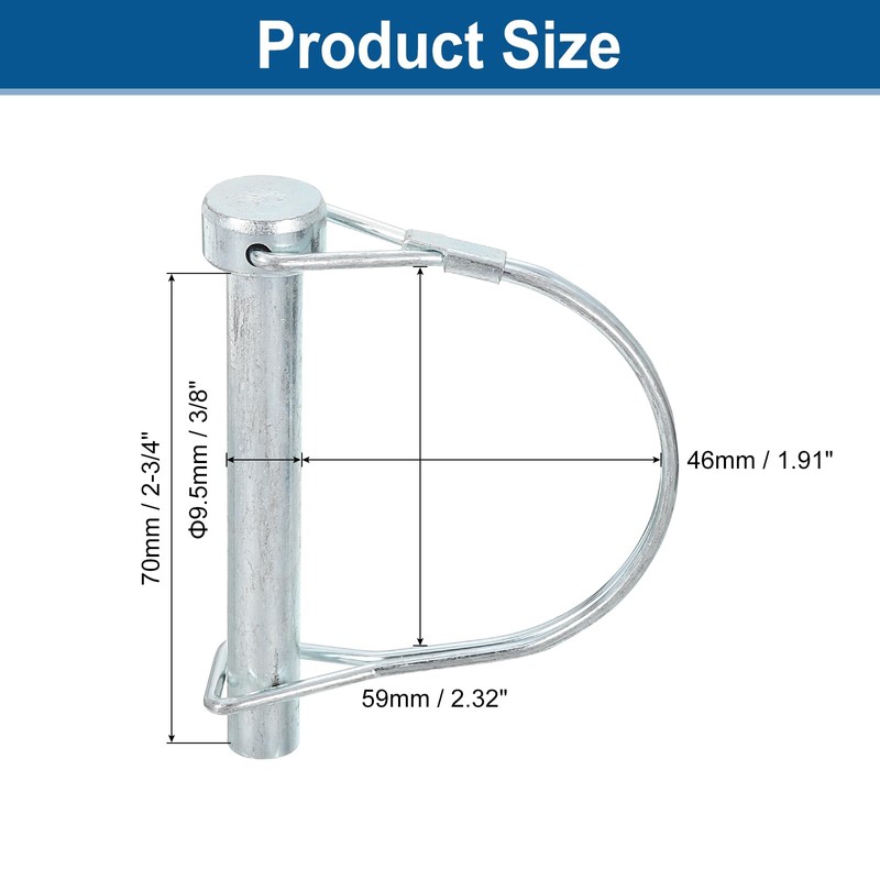 - [Size] Pin diameter: 9.5 mm (3/8 inch); Pin length: 70 mm (2-3/4 inch); Coil inner length: 46 mm/1.81 inch; Coil inner width: 59 mm/2.32 inch; Ring thickness: 2 mm/0.08 inch; Package includes: 4 pieces x Linchpin with ring