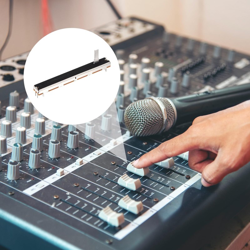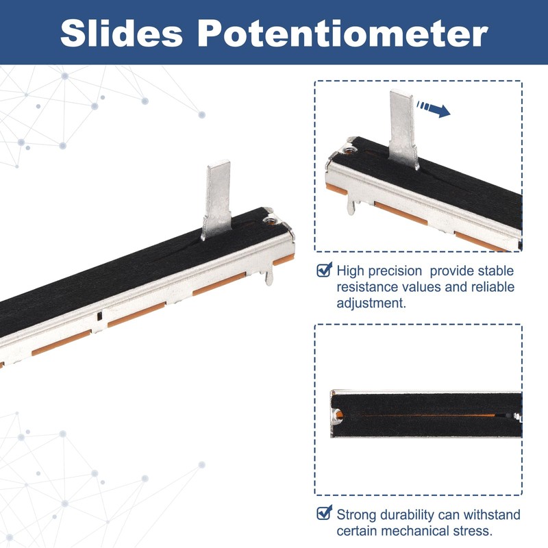 - This sliding potentiometer is compatible and versatile. It can be used to adjust parameters such as volume, pitch and brightness of electronic devices such as TVs, speakers and mixers, as well as adjusting components in experimental circuits. It has high precision, can provide stable resistance values and reliable adjustment performance, have high durability and withstand certain mechanical stress and environmental changes.