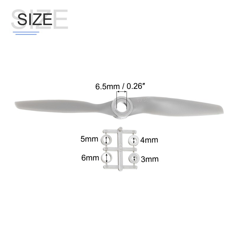 • Propeller Diameter: 5 inch; Pitch: 5 inch; Hole Diameter: 6.5mm/0.26inch; Propeller Washer Size: 6mm/5mm/4mm/3mm; Root Thickness: 6.8mm/0.27inch; Blade Quantity: 2