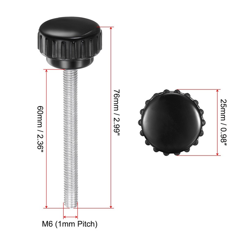 - Standard thread size: M6 (1 mm pitch); thread length: 60 mm / 2.36 inches; knurled head diameter: 25 mm / 0.98 inches; total height: 76 mm / 2.99 inches. The screws are neat and clear, the force is uniform and it is not easy to slip.