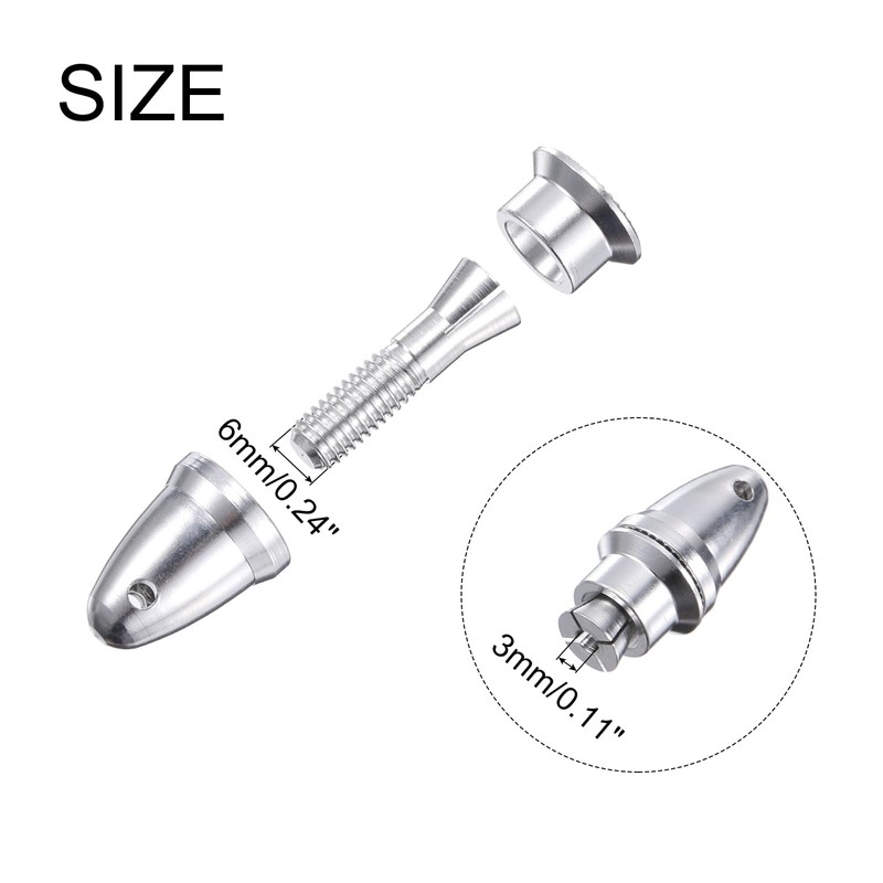 • The RC aircraft propeller adapter, size: 3 mm (bore) x 6 mm (output shaft); colour: silver; material: aluminium; in package: pack of 6 RC plane spinners