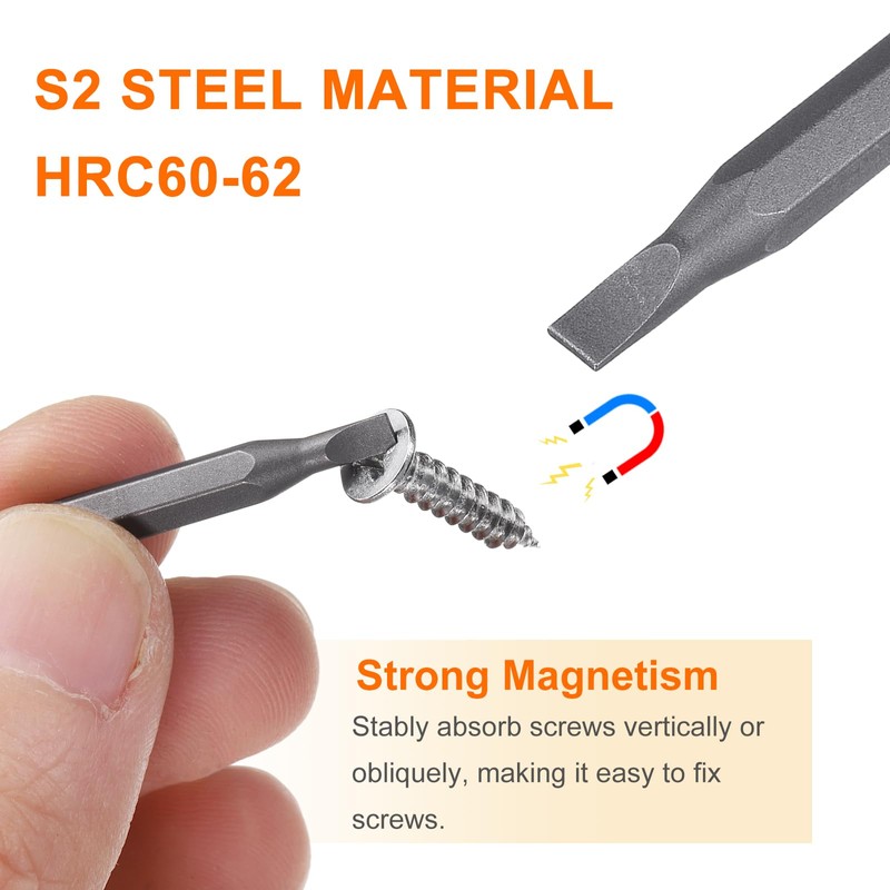 - Material - The screwdriver bits are made of specially heat-treated S2 steel with high strength and hardness (HRC58-62), are durable and bend-resistant, and the surface is sandblasted for improved grip and corrosion resistance