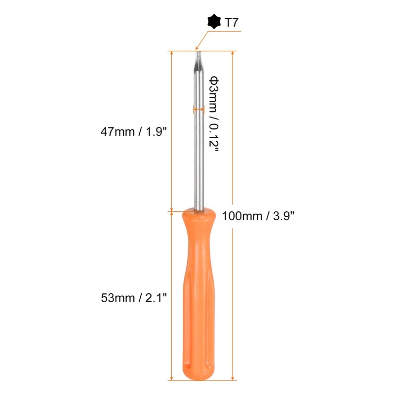 - Size - bit type: T7, total length: 100 mm / 3.9 inches, bar size: 3 x 47 mm / 0.12 inches x 1.9 inches (D*L), handle length: 53 mm / 2.1 inches.