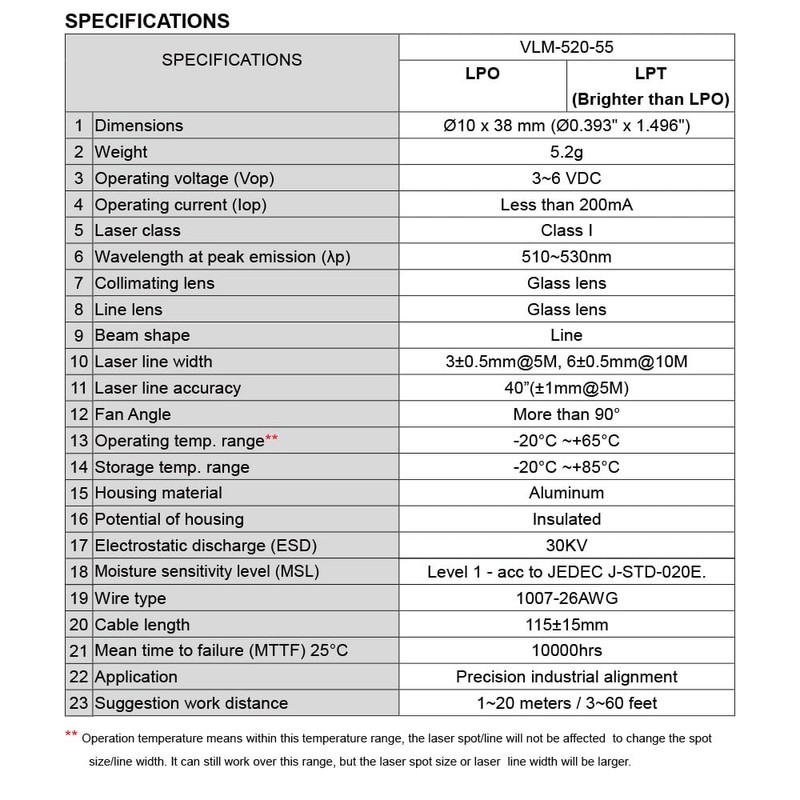 • Wave length: 520nm. Output power: Class II - less than 0.9mW. 3~7 VDC operation. Dimensions: D0.393" x 1.496" (D10 x 38 mm).
