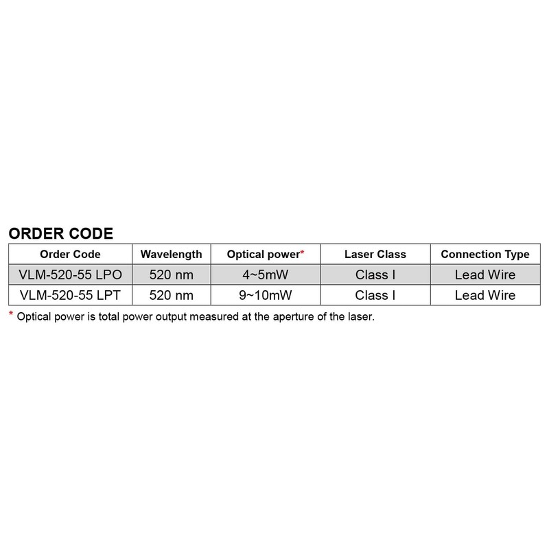• This module has an integrated optic, direct green laser diode, and APC driver circuit. Mean time to failure(MTTF) 25°C: 10,000 hours