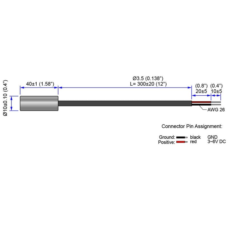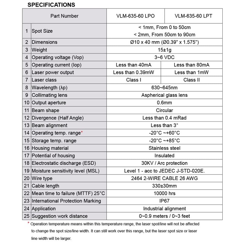 - Specifications: Dimensions: Ø10 x 40 mm (Ø0.39" x 1.575"), Wavelength: 630~645 nm, Laser Output Power: Class 1 – Less than 0.39mW (eye-safe), Beam Divergence (Full Angle): <0.4 mRad, Operating Voltage: 3~6 VDC