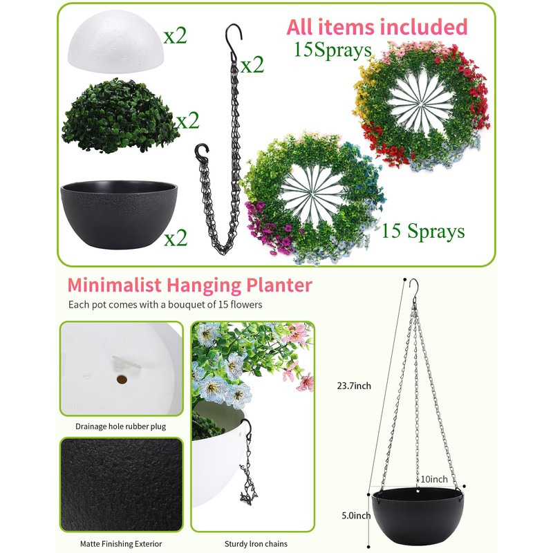 - [Value Artificial Flower Set]: This set of artificial hanging flowers for outdoors includes 30 lush silk daisies, two minimalist hanging planters, two artificial grass balls, and two foam inserts. Elegant hanging decor to add life to any of your spaces