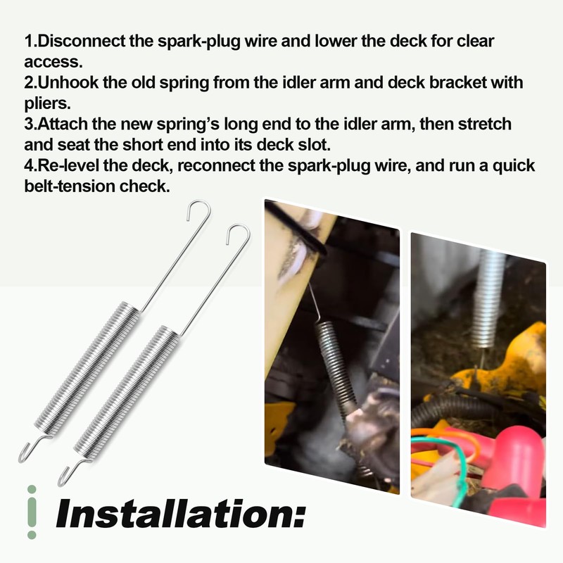 - Installation: Hook one end to the idler arm, stretch the other into the deck bracket, and the spring snaps into place