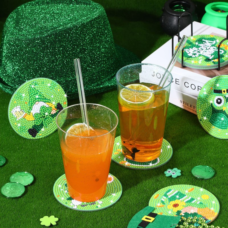 - St. Patrick's Day Diamond Art Coasters Set: you will obtain 8 pieces of diamond painting coasters, which measure about 3.94 inches in diameter, including 8 pieces of cork pads, which measure about 3.15 inches in diameter, 1 piece of iron holder with the measurement of about 4.33 x 1.97 x 0.98 inches, 1 piece of drill pen, 1piece pectin, 1 piece of diamond tray and 1 pack of colorful diamonds, sufficient accessories to satisfy your daily demands for decoration and crafts making