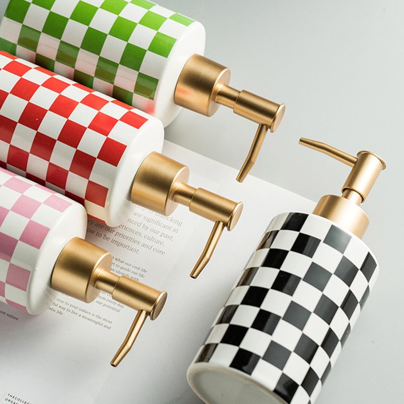 - Modern plaid soap dispenser. The gold pump adds an elegant accent to your bathroom, kitchen or bathroom. Available in 4 colors, pink, red, black and green to match any decor. This item has a low profile appearance and design