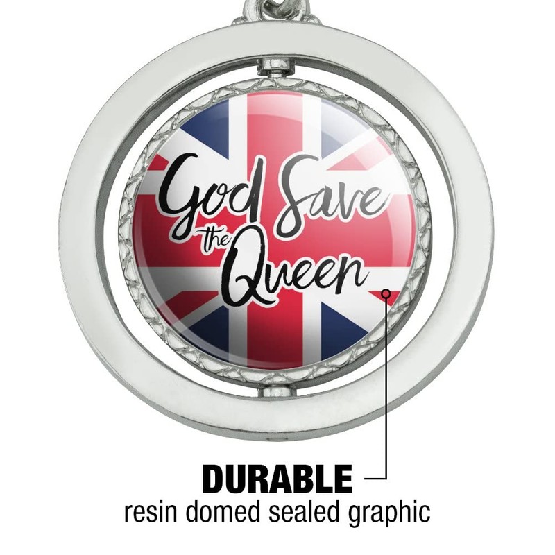 Queen Elizabeth II God Save the Queen keychain will help you make a statement with this truly unique keychain! The center circle with the cool design shown spins completely around. The keychain is chrome plated metal and double-sided with the resin-topped design. The round part of the keychain is approximately 1.3" (3.3cm) in diameter. Sold individually.