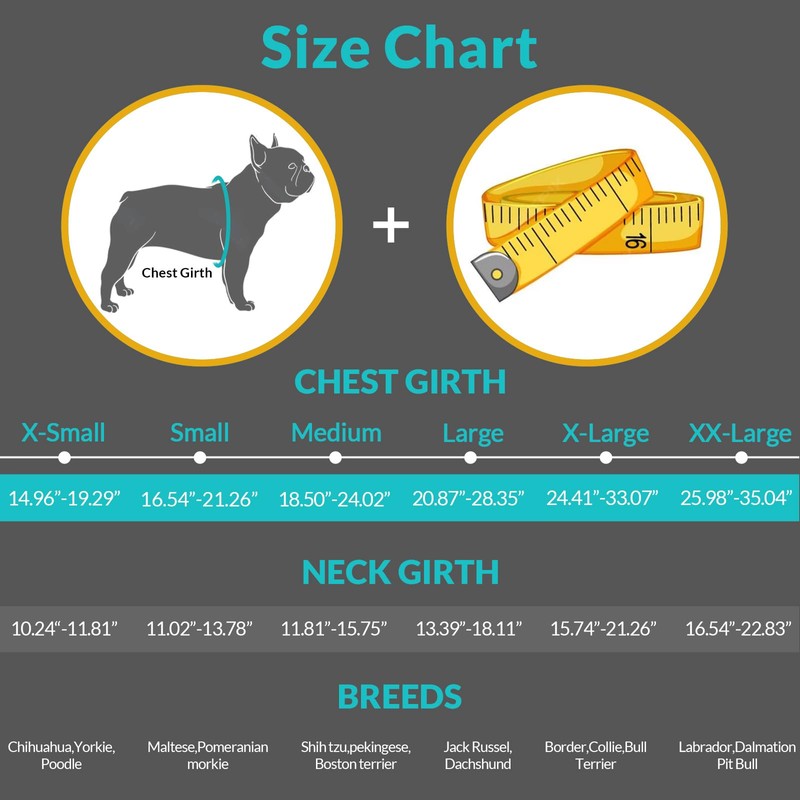 X-Small== Chest Girth:14.96"-19.29" --- Back Length:7.87" --- Neck:10.24"-11.81"