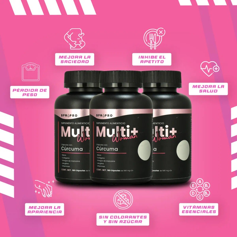 Multi plus Woman; Es un multivitamínico formulado especialmente para la mujer que además te ayudará a bajar de peso ya que gracias a el vinagre de sidra de manzana, pimienta negra y jengibre inhiben el apetito, lo que te ayudará a no sentir tanta hambre durante el día.