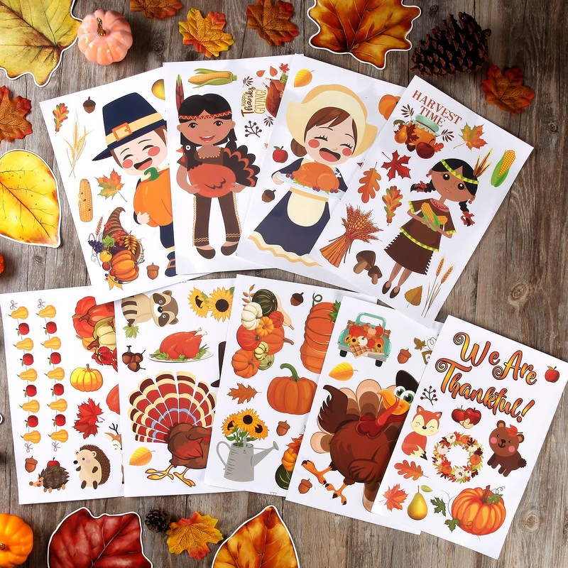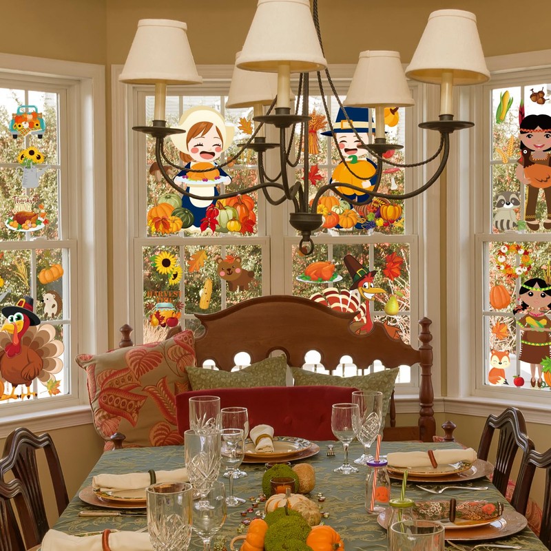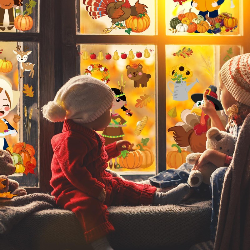 Quera 9Pcs Thanksgiving Window Clings Decals Fall Autumn Turkey Pilgrims Girl boy Window Decorations Pumpkin PVC Window Stickers for Harvest Party Home Office Glass Mirror Decor 7.9 x 11.8