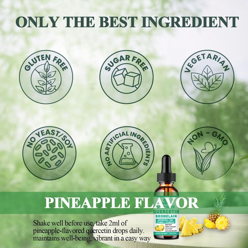 • ORGANIC QUERCETIN WITH BROMELAIN: Ouercetin with vitamin c and zinc supplement for both adults and kids.The Quercetin liquid drops contains 1000 mg natural Quercetin and 500 mg Bromelain. Quercetin, a flavonoid for your body's natural defenses, immune system booster, boasts antioxidant and anti-inflammatory. And Bromelain derived from pineapple, exhibits enzymatic action for digest health and revitalizes energy levels. Together, these two natural remedy synergistic to safeguard your health, provide a constant source of energy and immune defense
