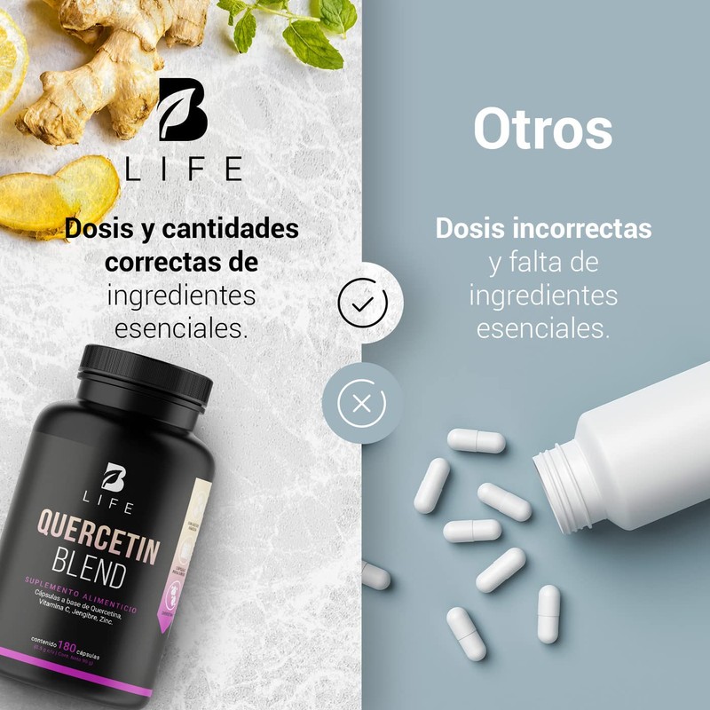 • Quercetin Blend es un suplemento alimenticio con 180 cápsulas a base de Quercetina, Vitamina C, Jengibre y Zinc.