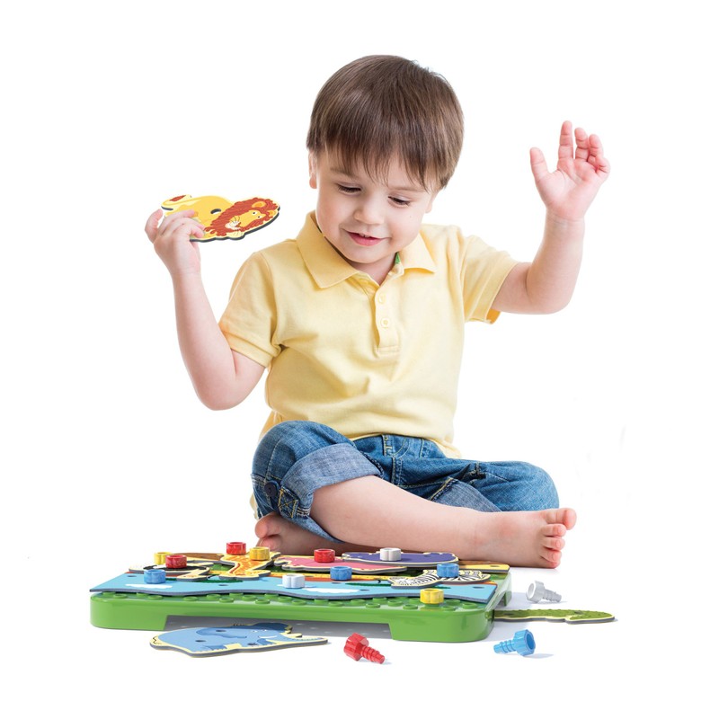 - The landscapes and animals of the Savannah move on the perforated board thanks to large, easy-to-use plastic screws
