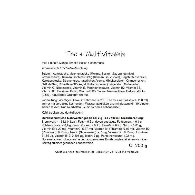 • This fruit tea contains multivitamins. Various vitamins packed as fruit tea with a delicious strawberry, mango, lime, coconut flavour