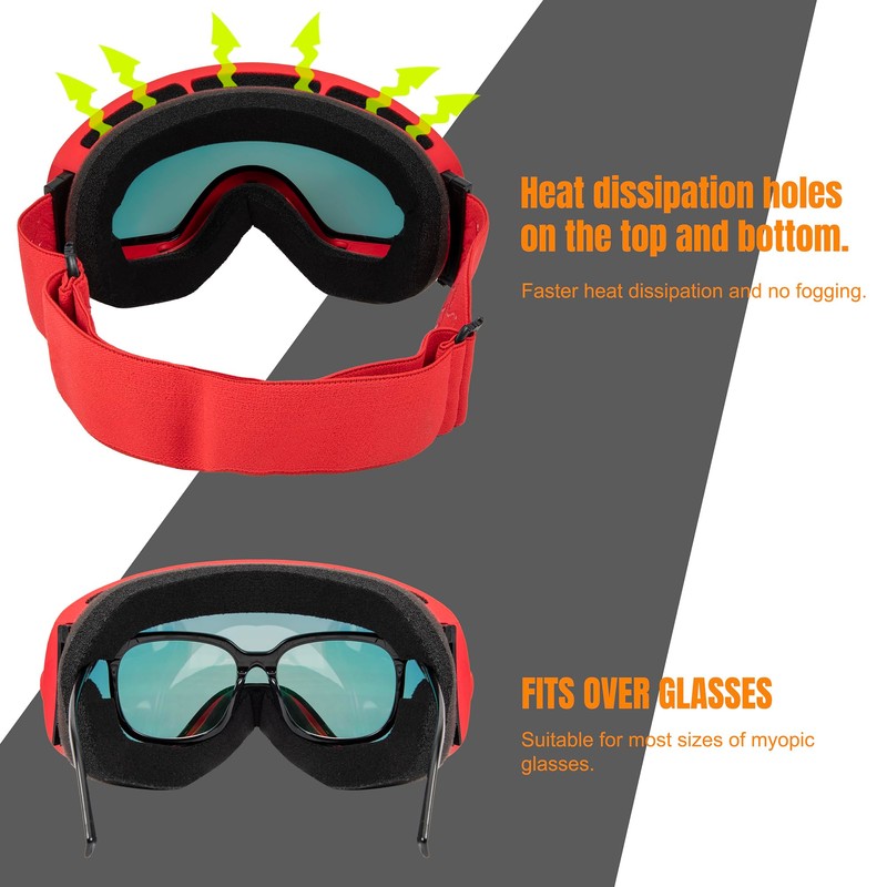 - Double layer, fully coated lens and anti-fog coating: the outer lens offers 100% UV400 protection and improved scratch resistance thanks to its advanced curing technology. The inner anti-fog lens (fog resistance range: -20°C ~ 70°C) and professional ventilation system minimise fogging and optimise air circulation within the goggles. The upper and lower vents dissipate heat from the inner lens for a fog-free skiing experience. Our ski goggles are more durable and robust compared to other ski goggles available on the market.
