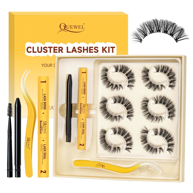 - Lash Clusters with Complete Accessories: This cluster lashes kit comes with everything you need to start a eyelashes clusters: 6 pairs of lashes clusters, one tweezer, one brush, and cluster lashes bond&seal. Comb the cluster lashes, apply the bond, attach the individual lashes cluster, and finally apply the seal – just so easy!Get the simplest steps to have salon cluster eyelash extensions effects with QUEWEL’s new 6 Pairs lash cluster kit