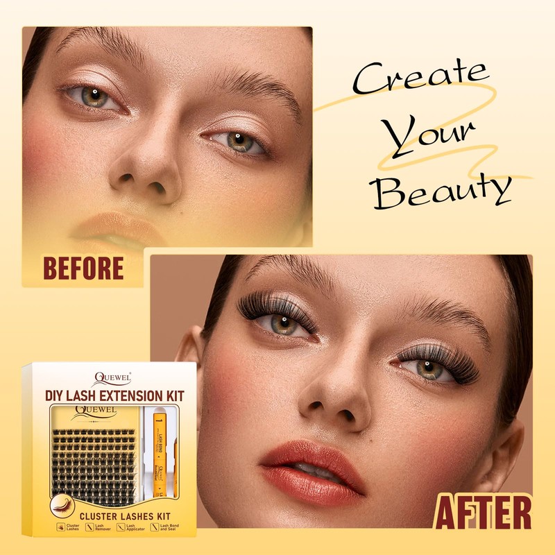 - DIY Lash Extension Kit: QUEWEL eyelash clusters kit comes with super affordable 144 pcs of lash clusters, lashes clusters bond and seal, lash applicator tool, and 5ml lash clusters glue remover. Our DIY eyelash extensions kit contains complete tools, very suitable for beginners. The exquisite production process only brings you natural lash clusters that perfectly fit your eyes, and show the charm of your eyes.