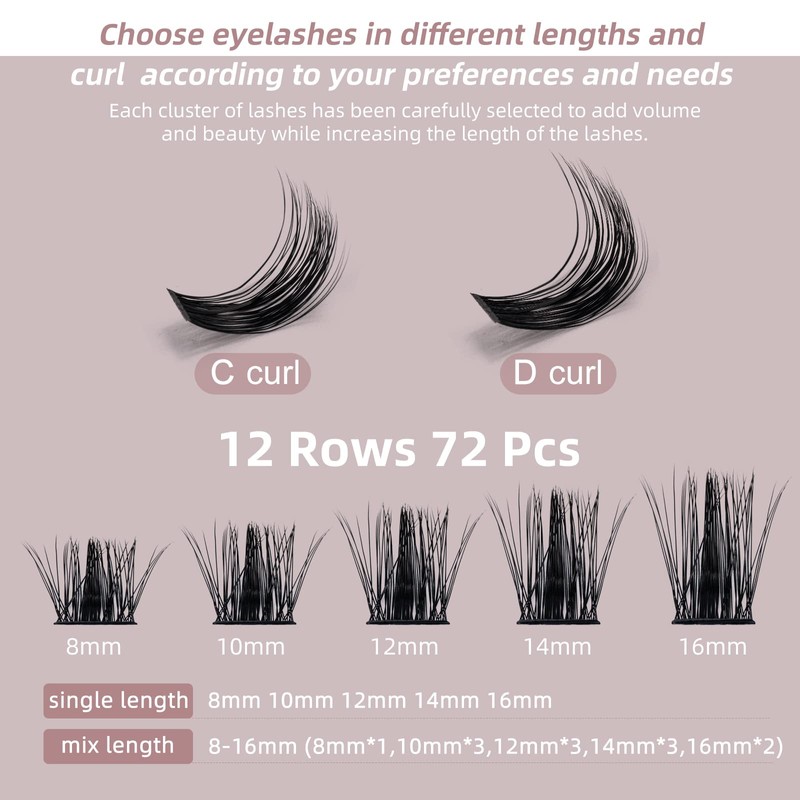 - Specifications: QUEWEL individual eyelash clusters, C and D curl, individual length 8, 10, 12, 14, 16 mm, mix length 8–16 mm (1 x 8 mm, 3 x 10 mm, 3 x 12 mm, 3 x 14 mm, 2 x 16 mm), 12 rows, 6 pieces per row, 72 pieces in total