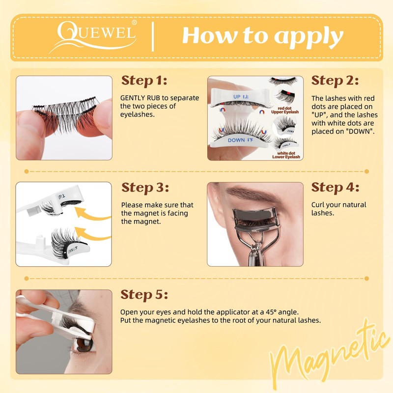 - Friendly for Beginners: Our magnetic eyelashes are equipped with magnetic applicator and instructions, you only need to follow the steps of the instructions. After taking out the eyelashes,gently separate them from the ends, find the small magnet on the eyelashes, and put the clip on the upper part of the eyelash is close to the root of the eyelash, then gently press it to close it, and suck the upper and lower eyelashes together to complete the wearing!