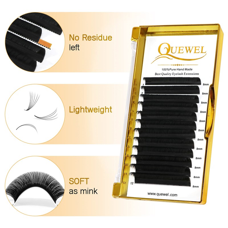 - QUEWEL Self-fanning eyelashes for eyelash extensions: 0.05 thickness, C curl, 8 mm length, 12 rows / tray, 100% handmade silk eyelashes for eyelash extensions.