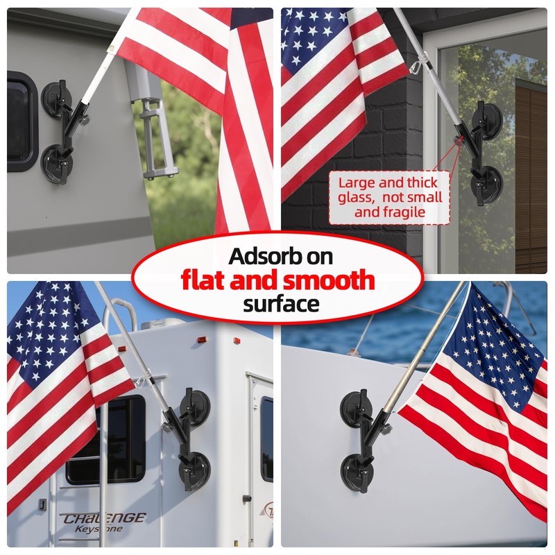 - Durable Material: Our suction cup flagpole is made of premium aluminum alloy and stainless steel with strong rust free coated. It has a very good stability and strong suction power, can stably adsorb on smooth surfaces.