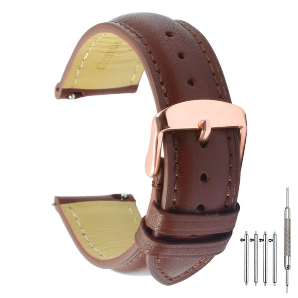 Quick Release Genuine Leather Watch Strap 20 mm Brown Replacement Strap Polished Watch Clasp Rose Gold Buckle Padded Super Soft, Bracelet