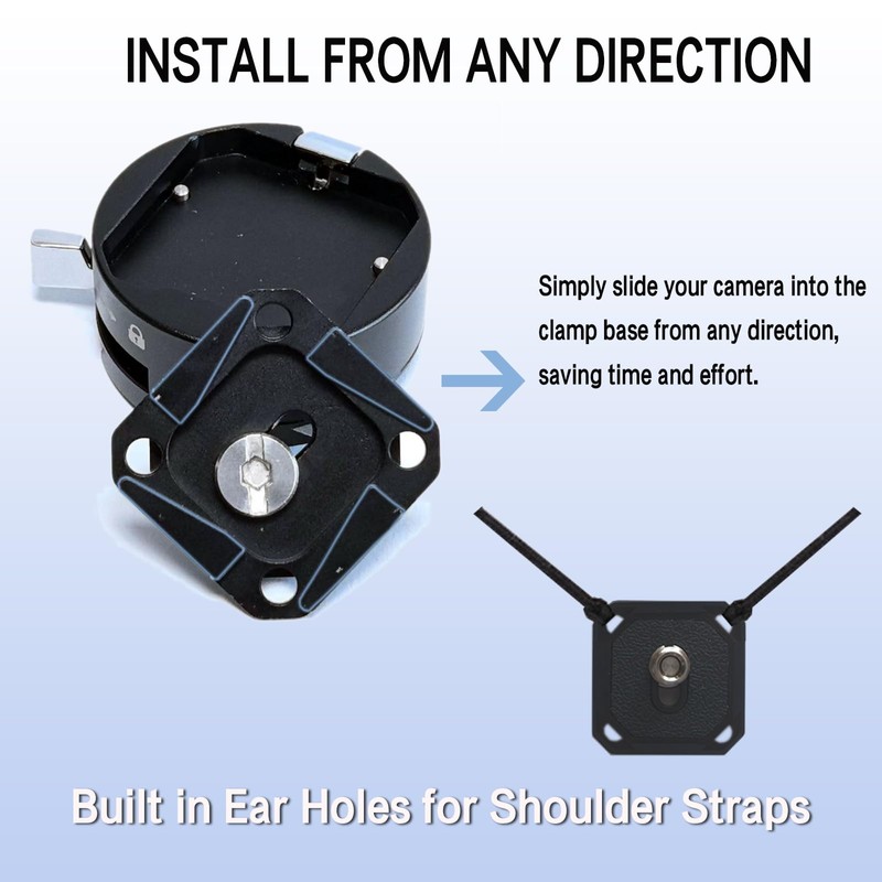 - [Safe and Reliable Lock] Adopts deadbolt mode to avoid accidental touching. Safe and stable, press the camera mounted quick release plate into the camera base fixture, the plate lock will automatically snap into place to securely lock it in place, quick release Allows for quick and easy mounting/unmounting of cameras or other tripod mounts, etc.