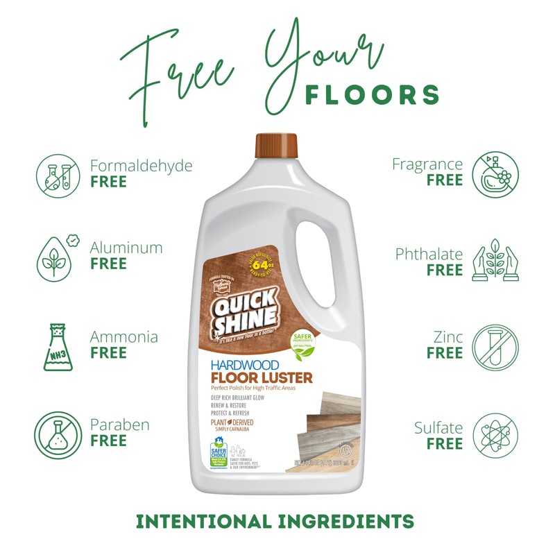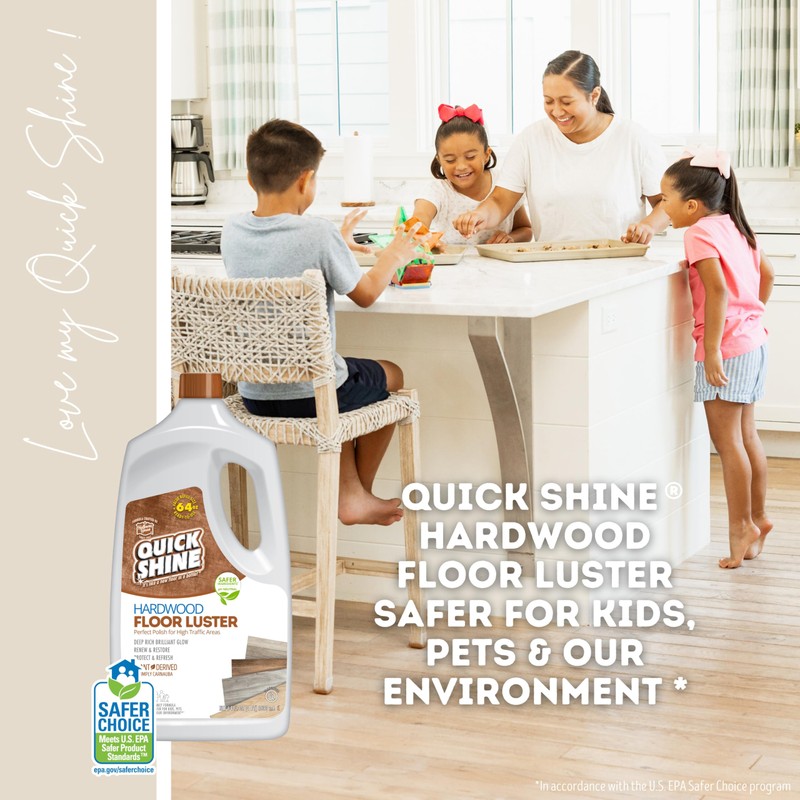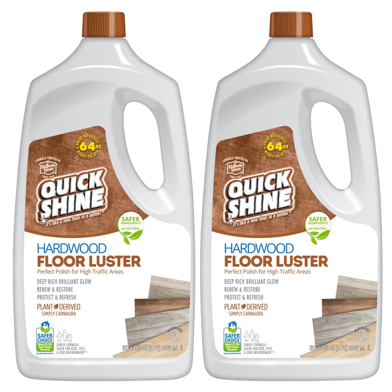 Restore shine and luster with Quick Shine Hardwood Floor Luster! Residential hardwoods can start to dull and scratch over time, especially in high traffic areas. Refresh their original shine before you consider sanding and refinishing! Quick Shine Hardwood Floor Luster, 64oz-2PK, in the convenient refill size, restores the color and beauty to hardwood floors. The plant based, pH neutral formula delivers a deep rich shine, protects against UV rays, fills in surface scratches and provides an even appearance.