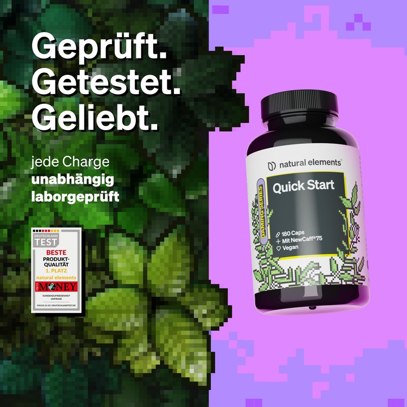 Quick Start - 180 Capsules - 6 Month Range - with Caffeine (NewCaff®75) - Vegan, High Dose - Produced in Germany & Laboratory Tested