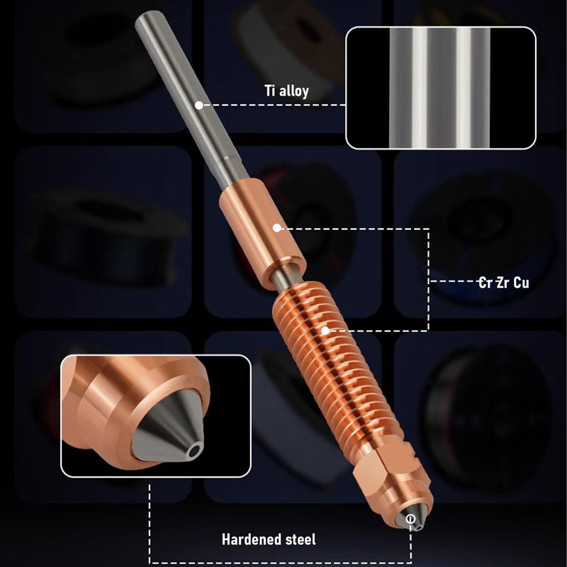 2. [Upgraded Materials] The insulation device is made of Ti alloy and can reduce heat conduction, while the nozzle is made of hardened steel and CrZrCu, with a Mohs hardness of 7.8.